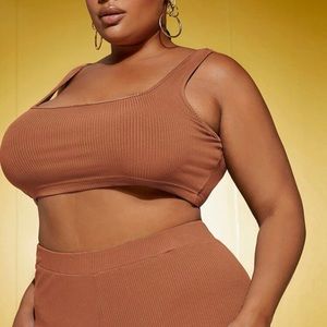 Feel confident and stylish in our plus size ribbed crop tank top and shorts set. This two-piece set is made from a soft and stretchy ribbed fabric that will hug your curves in all the right places. The crop tank top features a square neckline and adjustable straps, while the shorts have a high waist and a relaxed fit. This set is perfect for a day out or a night on the town. It can be dressed up or down, making it a versatile addition to your wardrobe. The neutral brown color makes it easy to pair with a variety of accessories. Whether you're looking for a comfortable and stylish outfit for everyday wear or a special occasion, this plus size ribbed crop tank top and shorts set is a perfect choice.