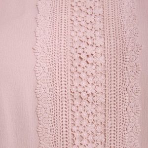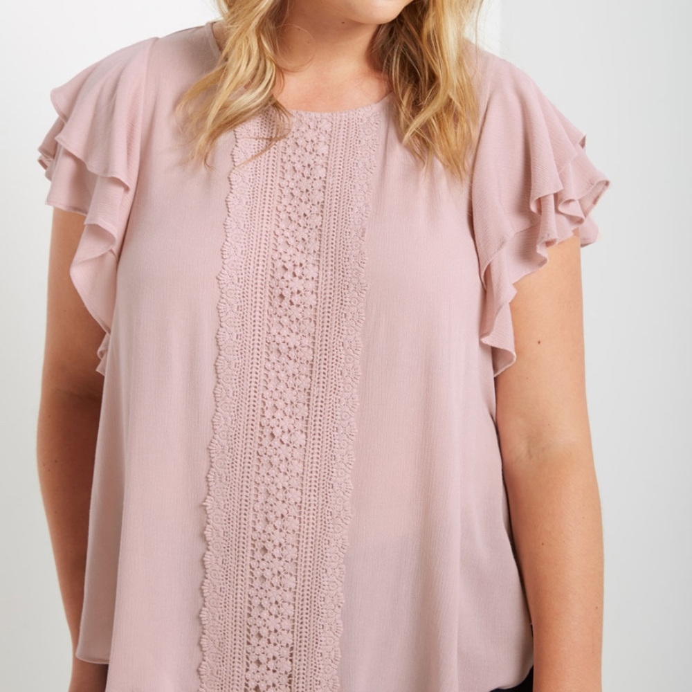 This plus size top is such a pretty color. Has ruffle sleeves and also lace detail on the front. 100% Rayon