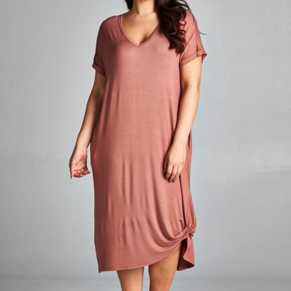 Plus Size Side Twist V-Neck Mid-Length Solid Rayon Jersey Dress with Hidden Pockets with Short Roll Cuff Sleeves