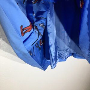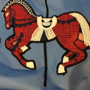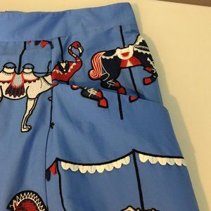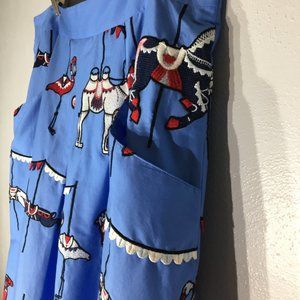 Super fun Maison Common blue skirt with embroidered carousel animals. Band at waist with zipper and inside button in back. Front has a middle pleat and two wide large pockets. Colorful embroidered animals - rabbit, frog, camel, flamingo, and horse. The horse is a see through mesh and cutouts (there is a blue lining underneath.) The black/red and the white banner flags are sewn just at the top leaving a textured 3d effect. Super cute and kitschy. It has a retro circle skirt vibe though it is not a full circle.