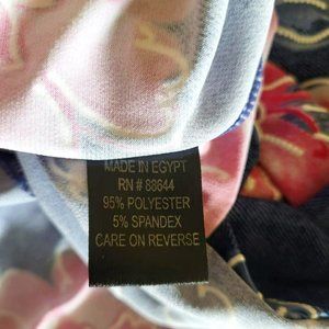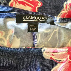 This plus size sleeveless maxi dress is size 14W. The dress is new and never worn. The manufacturer is Glamour. The dress has a scoop neck line and is a beautiful pink floral design on denim tone material. Material is 95% polyester and 5% spandex, machine washable. See pictures for more details.