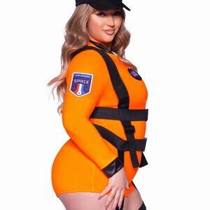 This 3 piece sexy astronaut costume features a zip-up romper with NASA badge accents, leg garter body harness, and matching NASA hat.