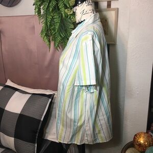 White, green and blue button down V-neck short sleeve blouse. Very gently pre-owned. Like new condition.