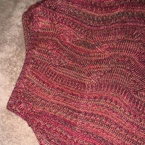 Loose knit sweater. Short sleeve. Hard to see in picture but holes are open. Will need camisole underneath. Sweater is primarily brown and burgundy with some greens and orange.