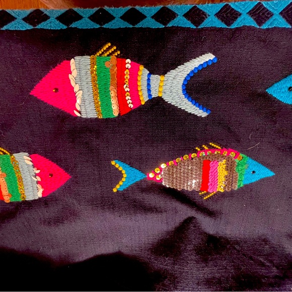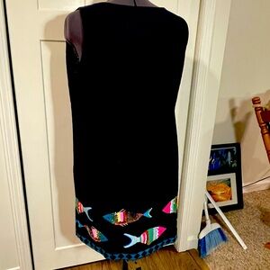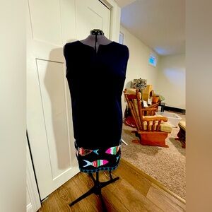Talbots for Women fully lined NAVY BLUE linen dress with adorable embroidered fish trimming the hem.