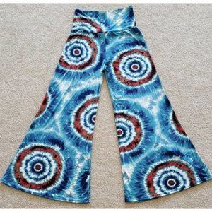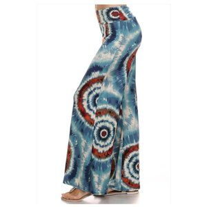 Swirl Tie Dye Wide Leg Palazzo Pants with foldover banded waist. Turquoise Blue/Brick Red/White color. Soft and stretchy. 95% Polyester 5% Spandex. Made in USA. Brand new factory direct.