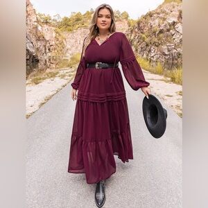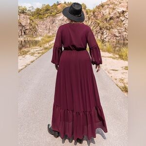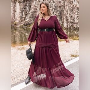 Plus Size Tie Neck Ballon Sleeve Tiered Dress