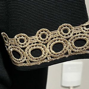 3/4 sleeve rayon/poly & spandex top with antique gold embellishments. Side splits.