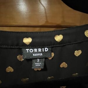 Black with gold hearts. Light weight. Very cute with jeans or black pants. Size 3 (torrid 22-24). View sizing info at torrid.com
