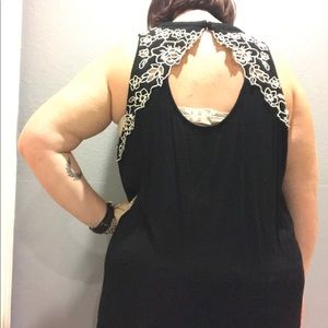 Worn once or twice! Super cute for date night. Floral off-white embroidery on chest and back. Key-hole opening in the back! Super cute tucked in a bit. Perfect for date night or school!