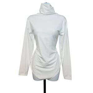 Women's white long-sleeve turtleneck bodysuit. It is a versatile piece that can be worn for various occasions, from casual to formal. This is a basic, wardrobe staple that can be paired with items like high-waisted jeans, skirts, or worn as a layering piece under blazers or jackets.
