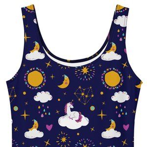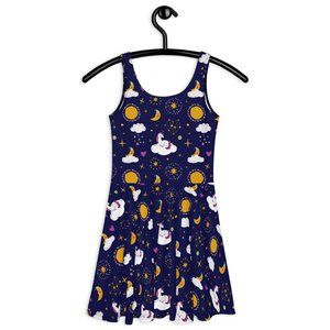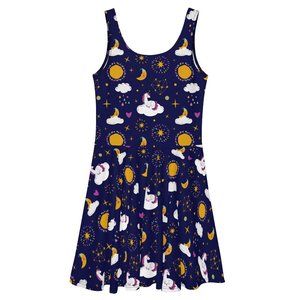 Unicorn moon clouds pinup dress. Flattering fit and flare silhouette. The elastic fabric is soft to the touch. 82% Polyester and 18% spandex.