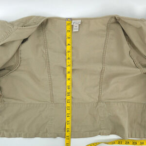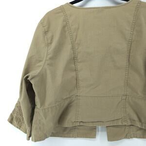 Features: Womens Bolero Jacket Single Hook & Eye Closure Short Boxy Cropped Length 3/4 Sleeve Taupe Canvas Embroidered Floral Detail on both Sleeves and the Center Opening of the Jacket