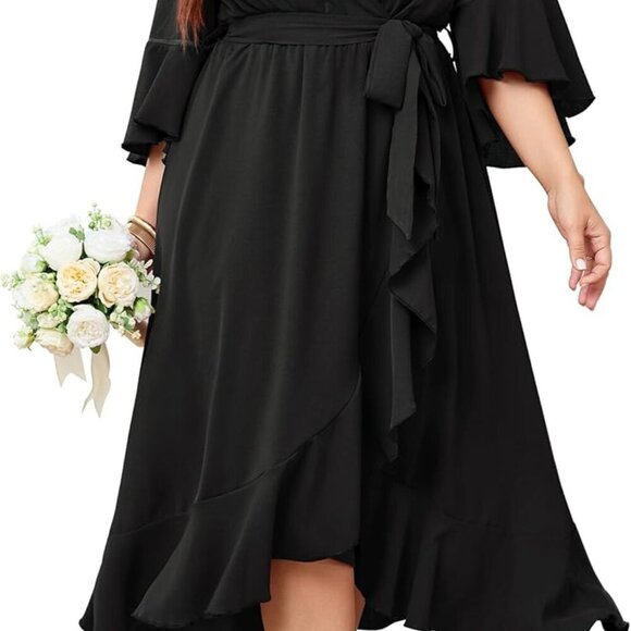 Plus Size Wedding Guest Dress - Fall V Neck Wrap Maxi Ruffle Hem — Elegant and Comfortable for Any Special Occasion.