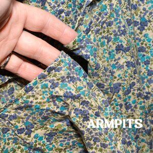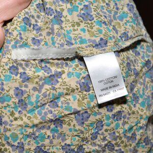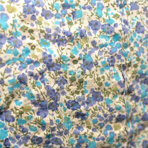 Adorable tiny ditsy floral pattern in shades of purple, blue and green over a tan background. Lightweight cotton material that's comfortably cool in warm weather. Button front accents add a little extra charm. A cute closet staple!