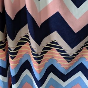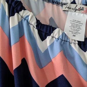 This summery off the shoulder dress is brightly colored and light weight . It features bell shaped arms and an above the knee cut. It is a size 2x and made by Love Squared.