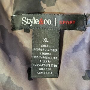 Plus Size Style & Co. camo puffer vest. (lightweight). Size XL ( 16-18). Snaps & zips in the front. Four pockets. Elastic in the back of the coat. pit to pit...23" length...27.25"