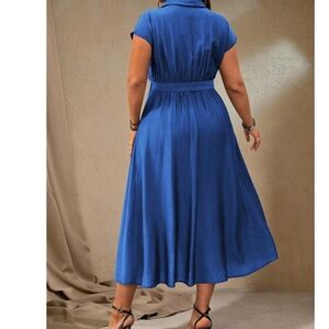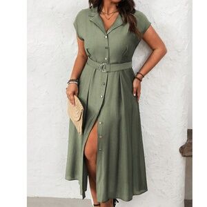Plus Solid Button Down Belted Short Sleeve Midi Dress