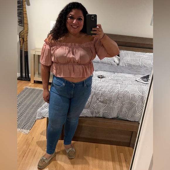 Dusty pink. Peplum, off the shoulder flirty top. Great for brunch with the girls or a steamy date night. 😉
