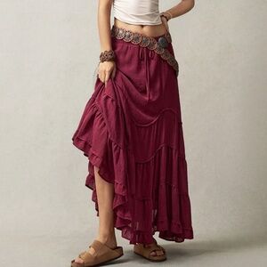 Plus Solid Stretchy Drawstring Waist Ruffle Hem Maxi Skirt