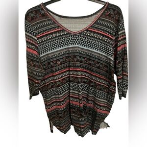 Add a pop of color to your wardrobe with this vibrant tunic. The geometric pattern in multicolor hues is eye-catching and modern. The scoop neckline and 3/4 sleeves make it perfect for any season, whether it's winter, fall or spring.