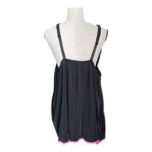 Seductive and flattering Passion Forever black lace flyaway babydoll nightie with vibrant pink satin trim and bow. Sheer lace bodice and adjustable shoulder straps provide a flexible fit and elegant drape. Perfect for romantic evenings or luxe sleepwear.