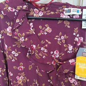 Plus Sz16/18 New Tags Faded Glory Blouse BOHO Maroon Floral Ruffle Scoop Neck