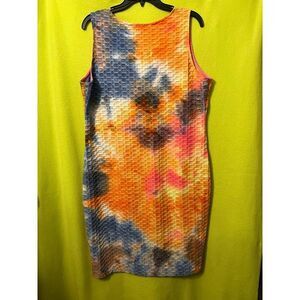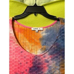 Rainbow multi color tye dye pattern all over. Honeycomb design on material. Stretchy material. Sleeveless. Fitted style.