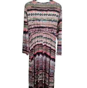 New size 1x maxi dress. 22.5 in pit to pit,59 in long,25 in sleeves. Polyester and spandex materials. Khaki color.
