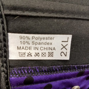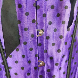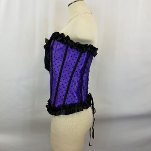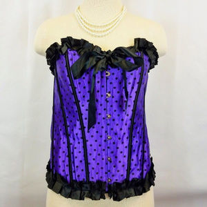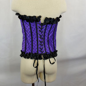 Purple with black polka dots corset and ruffles near breast area and bottom hem . Good condition Measurements flat Armpit to armpit: 16 Waist: 15 1/2 Bottom hem: 16 Length: 16 90% poly, 10% spandex Please consider when measuring this garment I had it halfway tied. SKU 3737 CB7-015