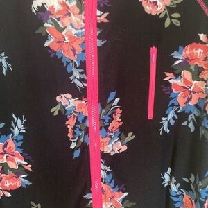 Perfect for spring/summer lightweight zip up super stretchy size 1X plus size black with floral detail, pink cuffs. Thanks for looking happy shopping.