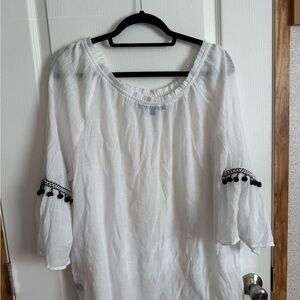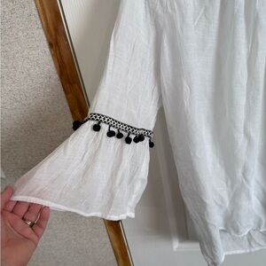 Chic white blouse with black tassel details. Relaxed fit and elegant sleeves.