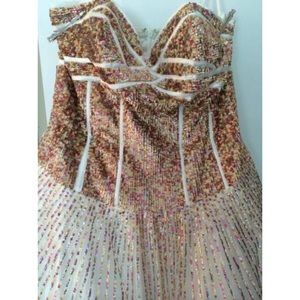 Make every eye turn towards you when you walk into prom with this gorgeous dress on. Gold, white, and pink sequins and it comes with a poof skirt to give it that extra "princess" look! It was bought in April of 2014 and has only been worn once.