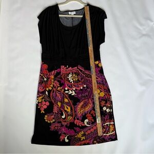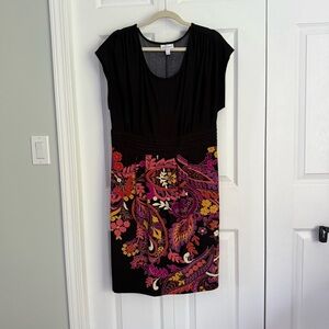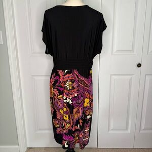 Elegant black dress with vibrant floral patterns. Perfect for any occasion. Sits just below knees. Elastic waist for a blouson effect. Could add a belt or a shrug. Wrinkle free fabric cool and comfortable. Sweater included