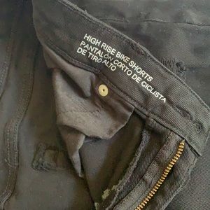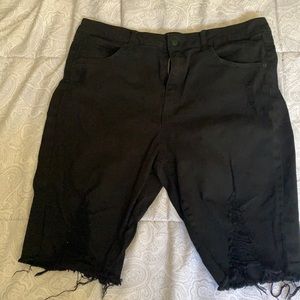 Black denim. High rise distressed biker shorts. Raw hem. Stretchy. Very light fading, worn only a few times. In great condition.