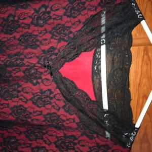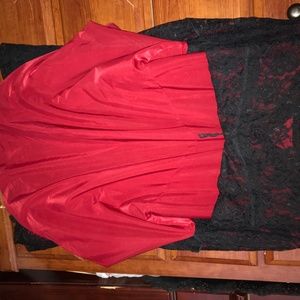 GORGEOUS red and black blouse. It’s a size 5 but I think it fits more like a 4x. Has red silky attached shell. Has been worn but no imperfections. Sleeves have slight flair at the bottom. The collar has an elevated lace trim