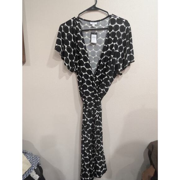 Pretty plus size black with circular white print classic wrap dress by avenue size 18/20 DVD style LBD little black dress funeral church courtroom dressy date night concert theater Broadway show brunch metropolitan city dress shopping urban NYC trip dressy casual versatile