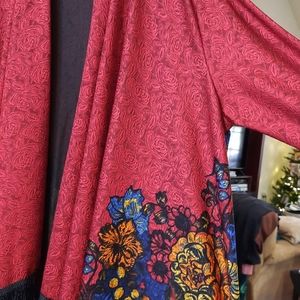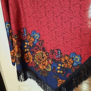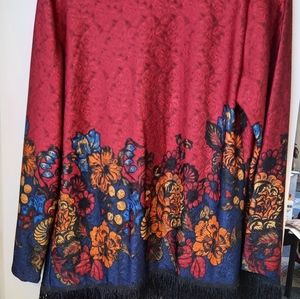 This is a very pretty jacket that is shawl like in appearance. It has long sleeves and lies draped in the front (no closures). The tag says 6x but it could be worn by a smaller size person due to the nature of the cut. The black fringe on the bottom really accents the rich colors.
