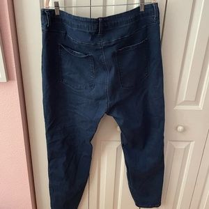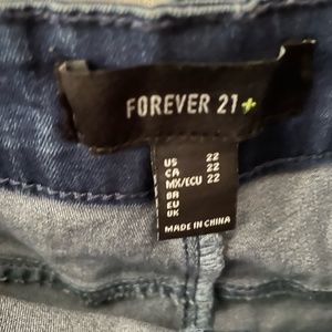 in great condition, plus size forever 21 denim with zipper and button at the fly. It's stretchy and soft denim. It has pockets in the front and back. in the thigh area it has a little bit of piling from wear. these are the skinny jean style denim