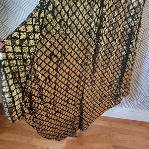Black and gold A-line silhouette sequin maxi dress. Never worn, tried on only. It's for the tall girls. This was an IG purchase, missed return window. The front length is approximately 64' the tail an additional 13'