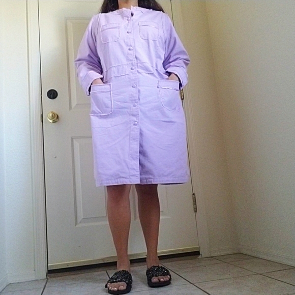 Plus size lavander/lilac purple jacket!! Brand new w tags!! Trench coat esk style made w denim esk material! Has distressed detailing along hems of the jacket! The details on this jacket are insane! This piece is freaking perfection ๐ Could also be worn as a dress or completely open, super versatile piece!! Would go PERF w the lilac pants I have avaliable on my shop for a monochromatic moment!! ๐