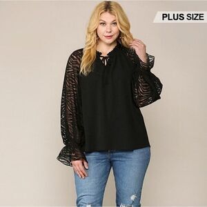 Plus size zebra burnout‎ sleeve ruffled neck bubble crepe blouse