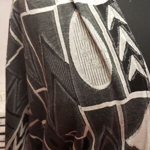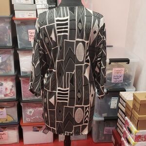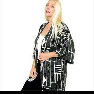 New plus size cardigan yes you heard me right just in time for fall a black white and gray asymmetrical cardigan with 3/4 sleeves this is the classy on trend cardigan that you will have to have for the fall season it will go with everything and the sizes available are 1x 16-18 2x 18-20 3x 22-24 yep true plus sizes and so pretty forgive my video I said kimono not cardigan made in the USA