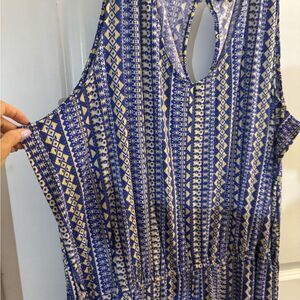 Stylish sleeveless dress with a blue and yellow geometric pattern. Perfect for casual outings