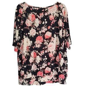 Floral Blouse, plus size top. Plus Size 4X. Short sleeve. No brand name tag. Does Have a size tag, care instructions, and materials tag. Beautiful no wear condition. NWOT. Pink and white flowers. Measurements approximate: Length 29 inches and pit to pit 27 inches. Non-smoking and pet-free home. It never hurts to make offers.