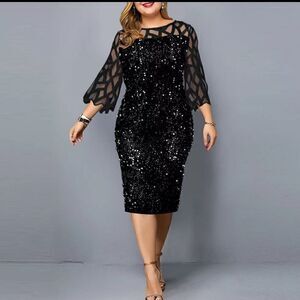 Beautiful Sequins Plus Dress with Mesh Sleeves. Zip up back and stretchy fit.