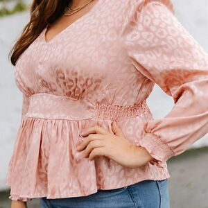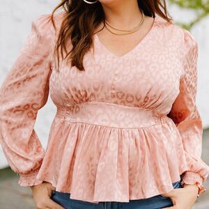 Date night approved! Stylish and eye-catching blouse: v-neck, long sleeves, peplum hem, flattering elastic empire waist, 100% polyester. Brand is true to size.