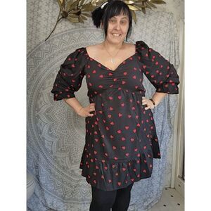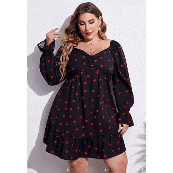 ❤ Plus Size Valentine’s Day Sweetheart Neck Long Sleeve Ruffle Hearts Print A-Line Black Dress NWT