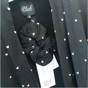 Plush Apparel Fleece Heart Print Robe Scrunchie Set New with tags Black fleece tie waist robe with a matching scrunchie Pink heat print Ultra soft Front patch pockets Removable belt waist