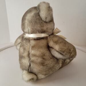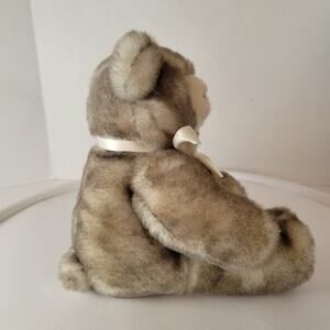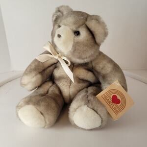 Vintage-style Heartline plush teddy bear in gray-brown tones with cream accents and a satin bow. Soft and huggable, approx. 12" tall. Original tag attached.